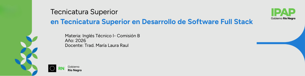 Mi nombre es María Laura, soy Traductora de Inglés. En este curso vamos a trabajar sobre los textos, la terminología, los conceptos, las cuestiones que atañen al texto técnico. Por otro lado, también apunta a adquirir nociones básicas del lenguaje, tanto oral como escrito, posibilitando el acceso a bibliografía en inglés específica para el desarrollo de software, logrando autonomía en la lectura e interpretación de textos técnicos. Por lo que en esta materia van a tener que investigar, utilizar herramientas de búsqueda, y elaborar glosarios.